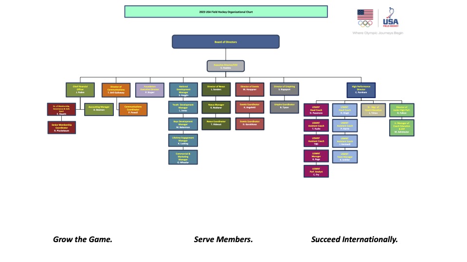| Liz Tchou | Senior Manager of Coach Education & Learning | ltchou@usafieldhockey.com | (910) 599-8222 |